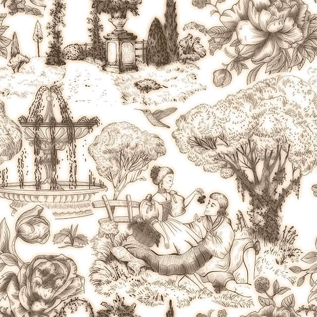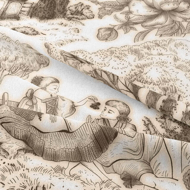 Unveiled by The Millshop Online, this masterpiece fabric is an illustrative narrative of classic splendour. Utilising a delicate inking technique, it evokes a softer, more poignant feel to its pastoral design. Its traditional toile de jouy pattern showcases quintessential country scenes, beautifully adorned with landscapes and figures that tell a story of their own.