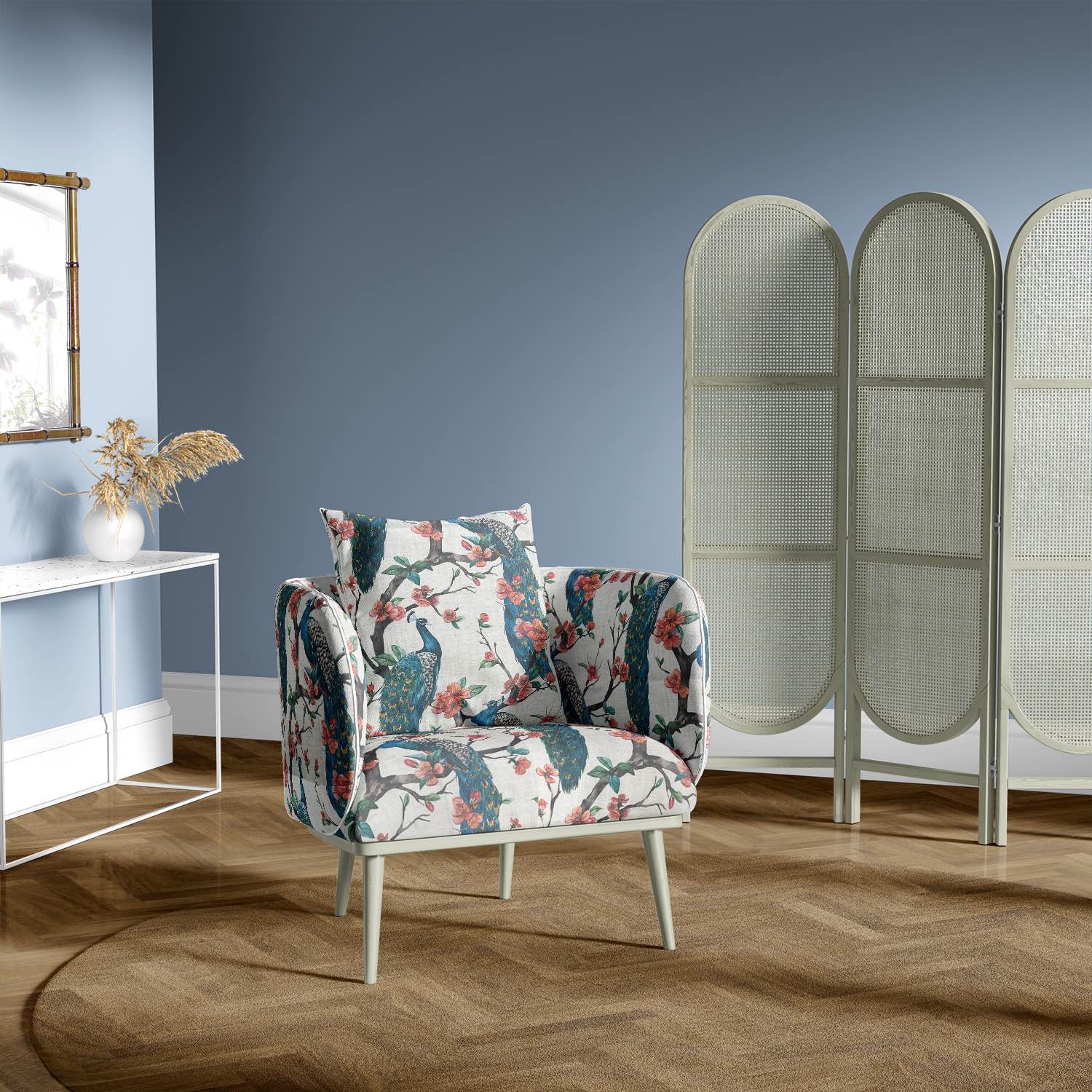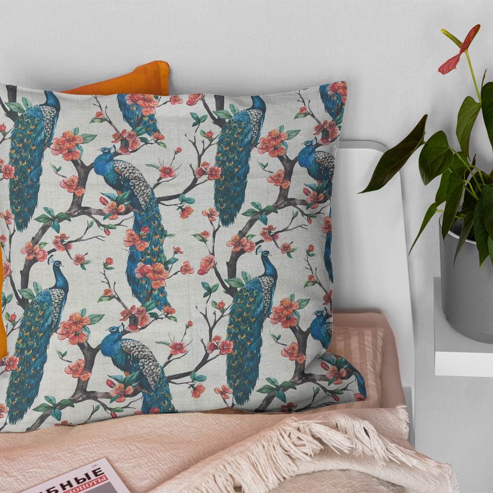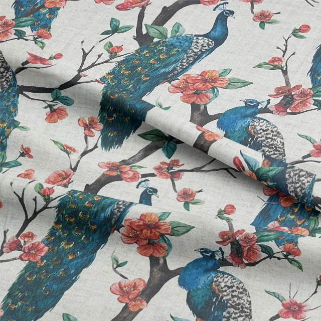 Embrace the splendour of nature and art with our magnificent Upholstery Fabric. This extraordinary printed fabric captures the majestic presence of peacocks, elegantly poised on ornate floral branches. Reveal your distinctive taste by adding this exquisite fabric to your home decor. It beautifully fuses the enchantment of nature with a timeless allure.