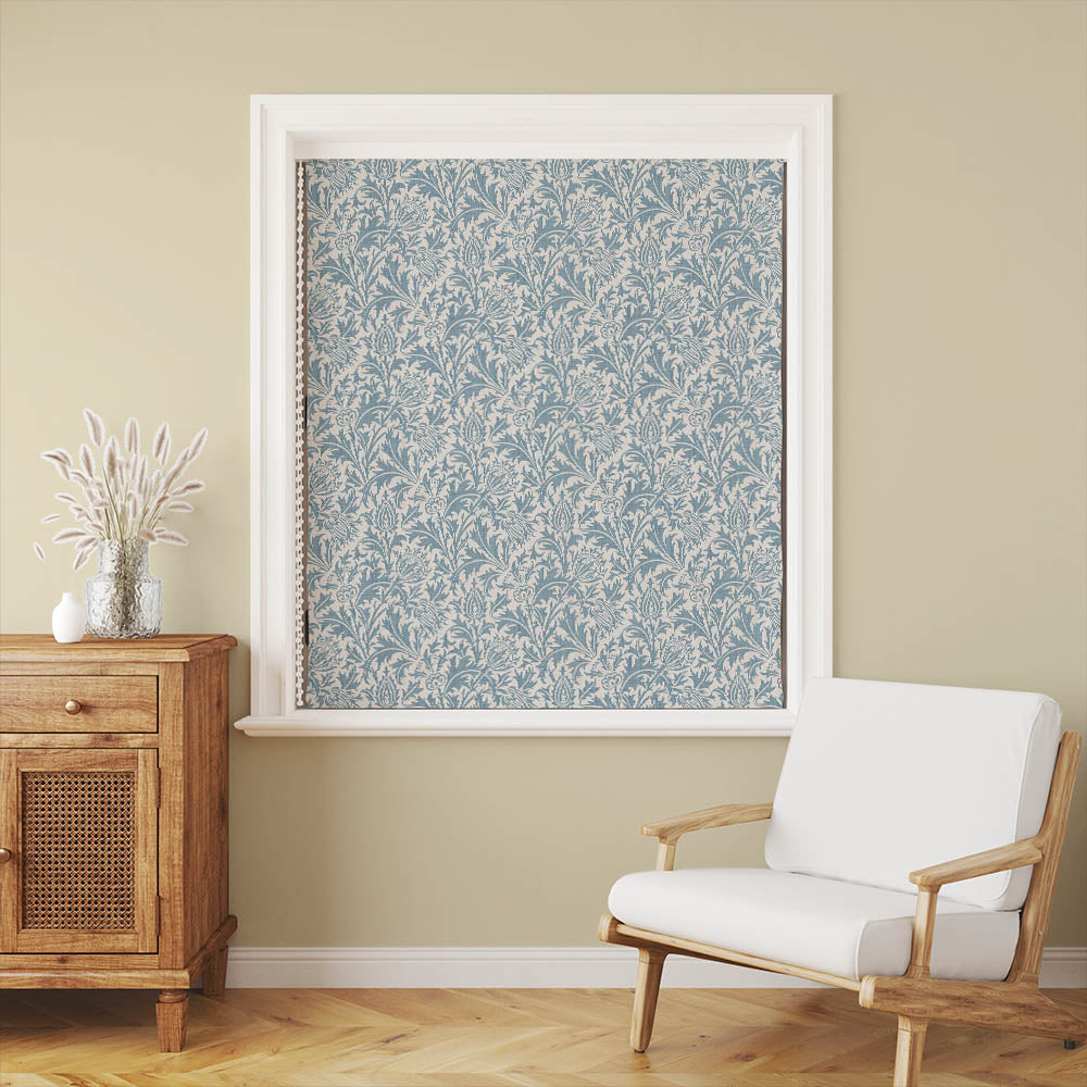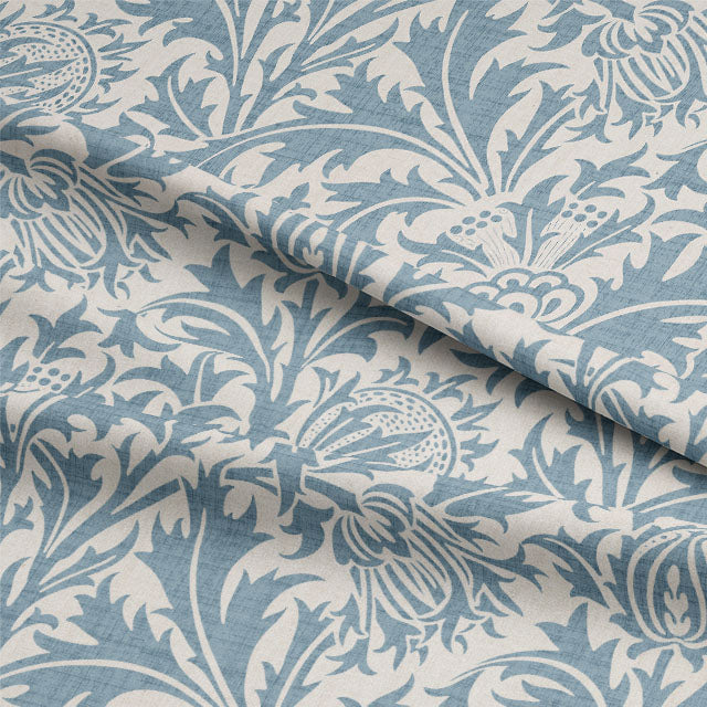 The fabric is beautifully adorned with a mesmerising leaf pattern, showcasing in-depth detailing that mirrors the extravagance of bygone eras while maintaining a firm footing in the context of modern interior design. The elegant Wedgwood Blue colour infuses any space with a serene and sophisticated aura, painting a picture of tranquillity and refined charm.
