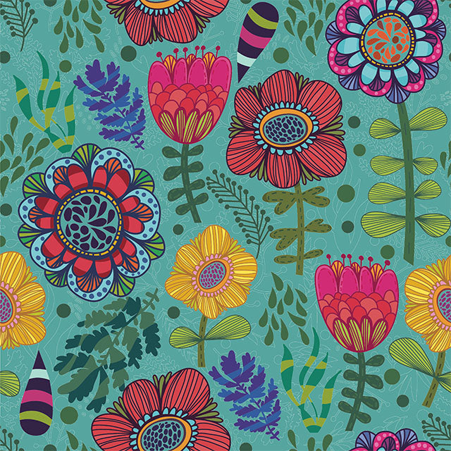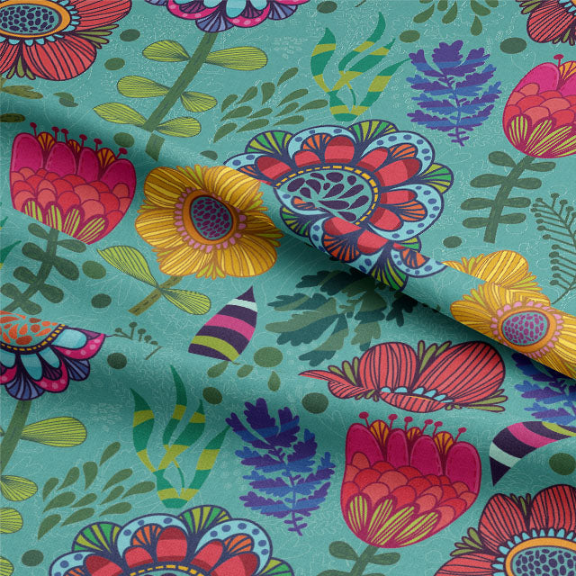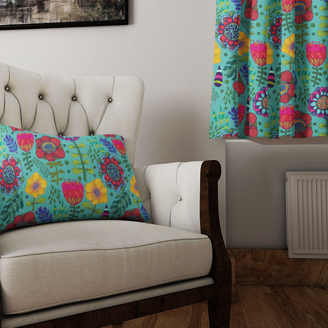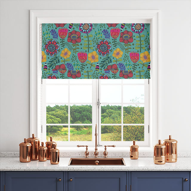 Inject vibrant joy into your interiors with the Folk Flowers Linen Curtain Fabric in Teal. This bold floral design features intricately illustrated blooms in shades of pink, yellow, red, and purple, dancing across a fresh teal ground. The richly detailed pattern brings a sense of playfulness and artistry, perfect for adding character to curtains, blinds, cushions or statement upholstery.