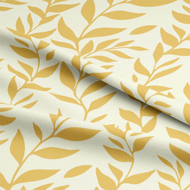Indulge in the allure of nature right inside your abode with our elegantly designed fabric. This material boasts an off-white cotton backdrop, graced with vertically aligned stems carrying vibrant yellow leaves. The design radiates a refreshing appeal that effortlessly complements all seasons.
