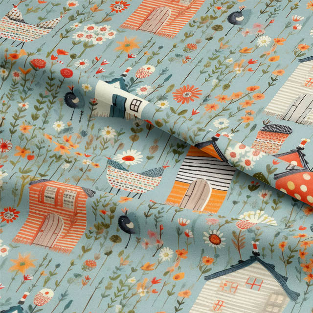 Folk House in Orange brings a whimsical charm to interiors, blending cottagecore inspiration with joyful storytelling. This playful design features charming little houses, flowers in bloom, and farmyard animals dancing across a warm orange backdrop. It’s a perfect choice for adding a sense of fun to children’s bedrooms, playrooms, or eclectic country kitchens.