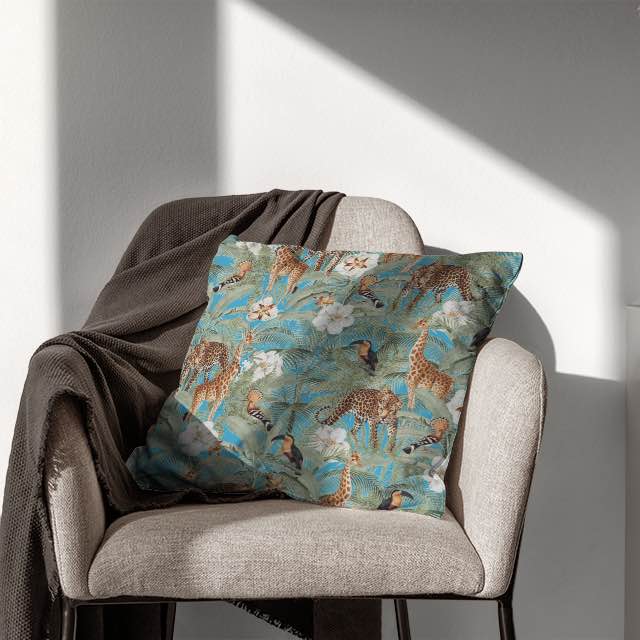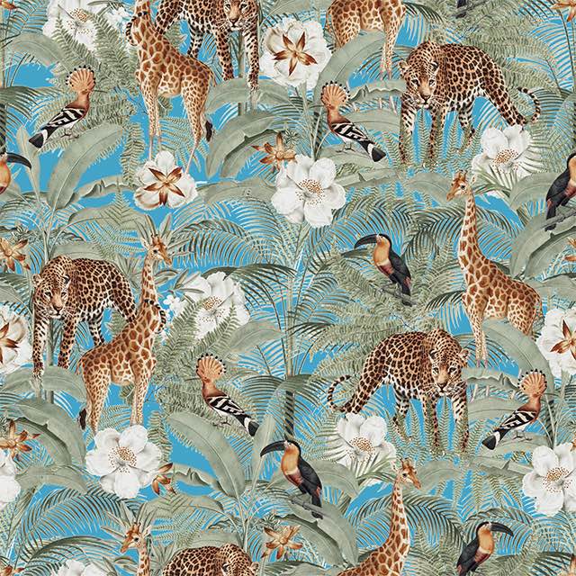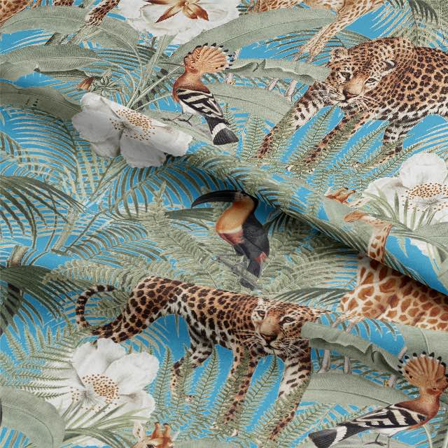 Immerse yourself in the rich tapestry of the safari with our uniquely designed animal fabric. This linen print wonders captures the exotic allure of the wild, with a captivating array of safari animals, including Giraffes, Toucans, and Cheetahs, beautifully nestled amongst vibrant flowers and leaves. This bold design promises a splash of colour and a touch of individuality to any room.
