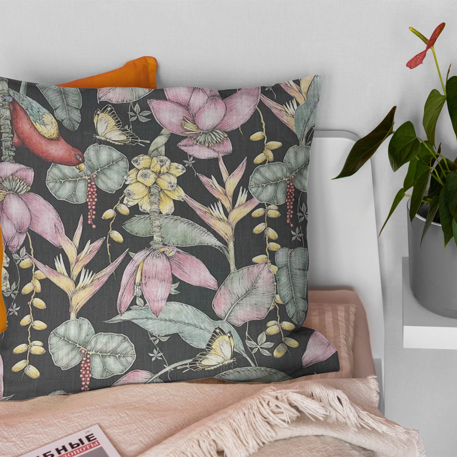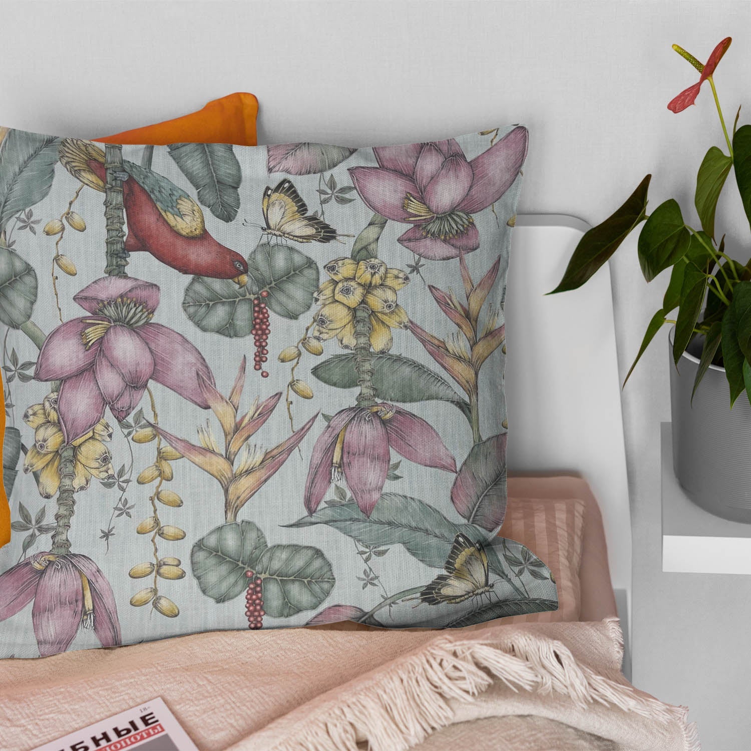 Discover the seamless fusion of art and elegance in this unique printed fabric. The design orchestrates a delightful symphony of avian splendor intertwined with floral charm and leaf motifs. This exquisite visual composition adds an invigorating touch to any living space.