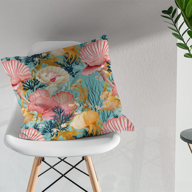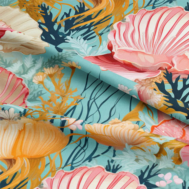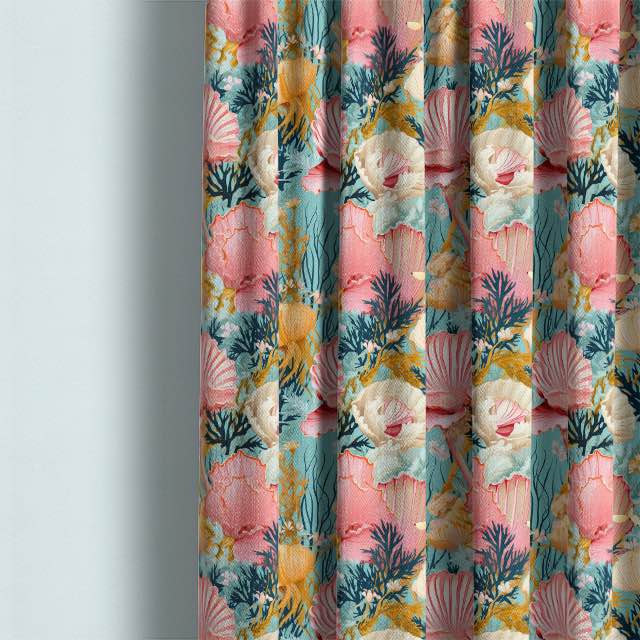 Experience the serenity and tranquillity of the Seychelles with our Curtain Fabric featuring an alluring Coral/Blue colorway. This premium linen print fabric is adorned with an intricate design of oversized corals and seashells set against a calming light blue backdrop, transporting you to the peaceful shores of Seychelles.