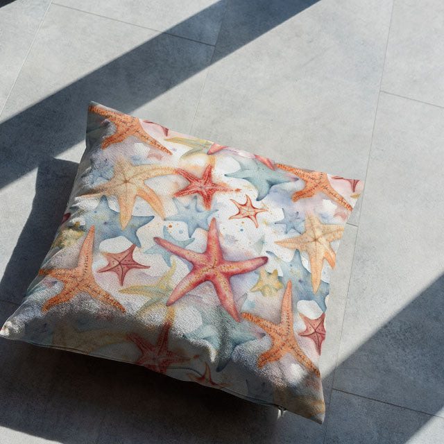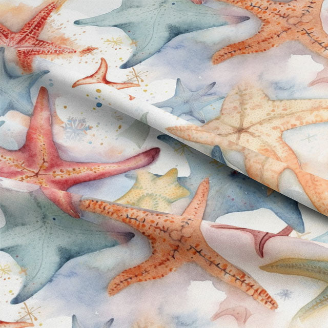 Delight in the allure of our exquisite fabric, adorned with a stunning starfish motif. This unique design comes alive in a vibrant orange shade, infusing an inviting warmth and coastal charm into any room. The starfish, beautifully depicted in varying sizes, add an intriguing visual depth to the fabric, making it a captivating focal point in any interior design.