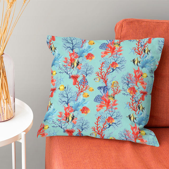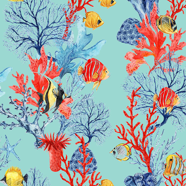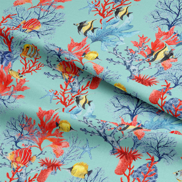 Immerse your space in a vibrant underwater world with our eye-catching cotton curtain fabric. Featuring an array of multi-coloured fish on an alluring azure coral background, this fabric is sure to make a fantastic statement in any room.