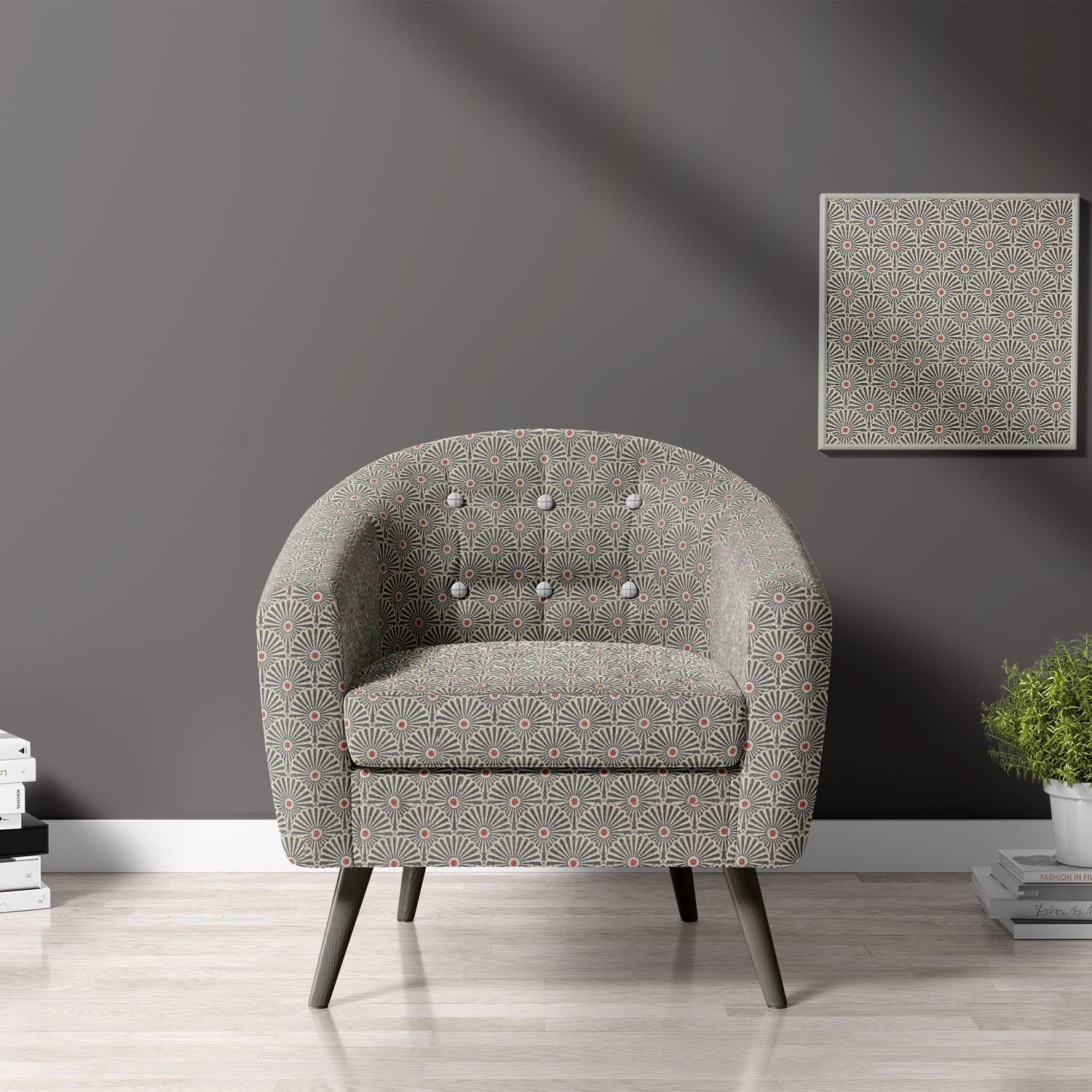 Introduce a bold, architectural statement to your interiors with our Welford Upholstery Fabric in Charcoal. This striking geometric design features a fan-like motif that brings rhythm and sophistication to any space. The deep charcoal hue, accented with subtle red highlights, adds depth and drama, making it an ideal choice for modern and Art Deco-inspired settings.