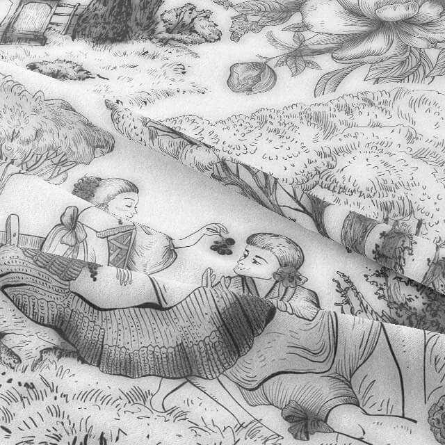 Immerse yourself in the timeless charm of our classic toile de jouy fabric. Crafted by the esteemed The Millshop Online, it boasts a tranquil colour palette, achieved using a delicate ink technique for a gentle and soothing aesthetic. Our fabric depicts a quintessential country scene, adorned with typical landscapes and figures – the essence of toile de jouy.