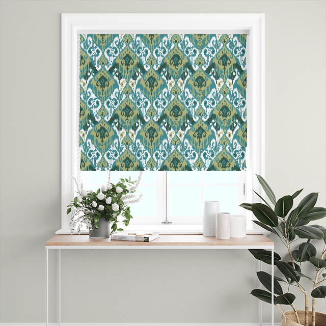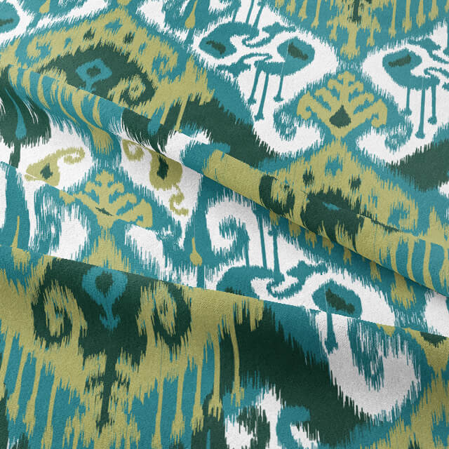 Experience the sublime boldness of our exclusive fabric, with its striking teal hues inspired by the complex art of Indonesian resist dyeing. The intricate design is printed on a luxurious Ikat cotton, creating a captivating piece of textile artistry.
