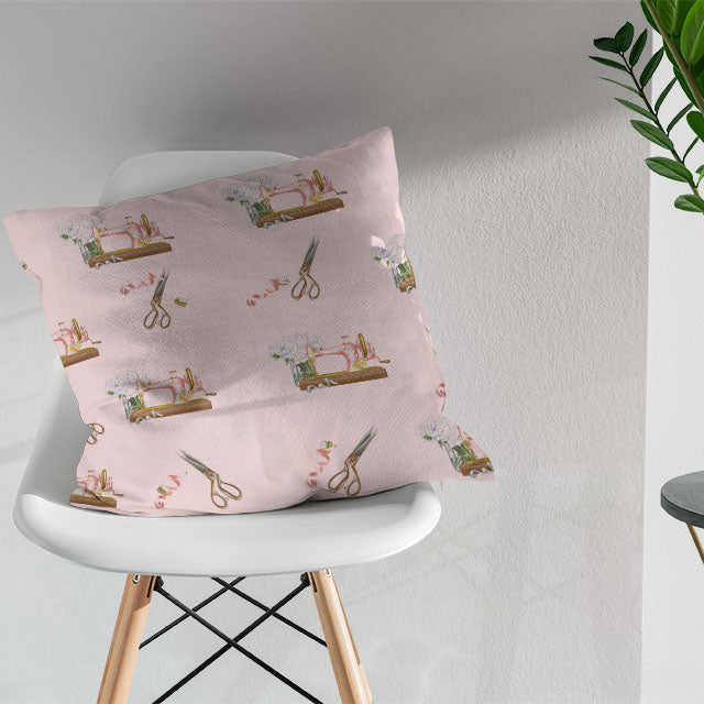 Embrace the artistry and charm of our specially crafted cotton fabric, a pure embodiment of elegance and style. The fabric is decorated with a vibrant pink backdrop, beautifully interspersed with intricate illustrations of sewing machines, scissors, and ribbons. This intricate design captures the heart of every sewing enthusiast and crafts lover.