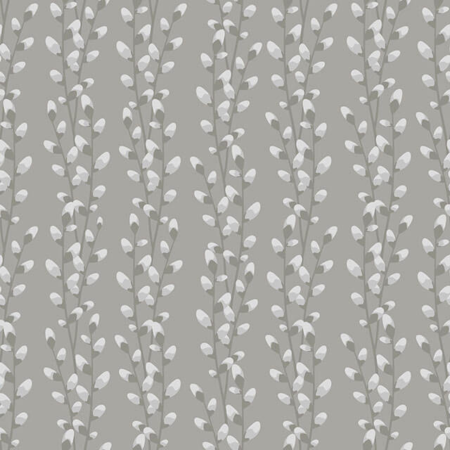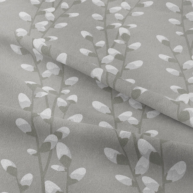 Experience the serene beauty of nature with the Willow Linen Fabric in Grey, crafted by the acclaimed designer Olivia Florence. The design captures the enchanting sight of early spring willow branches adorned with furry catkins, the pattern trailing vertically upwards throughout the fabric.