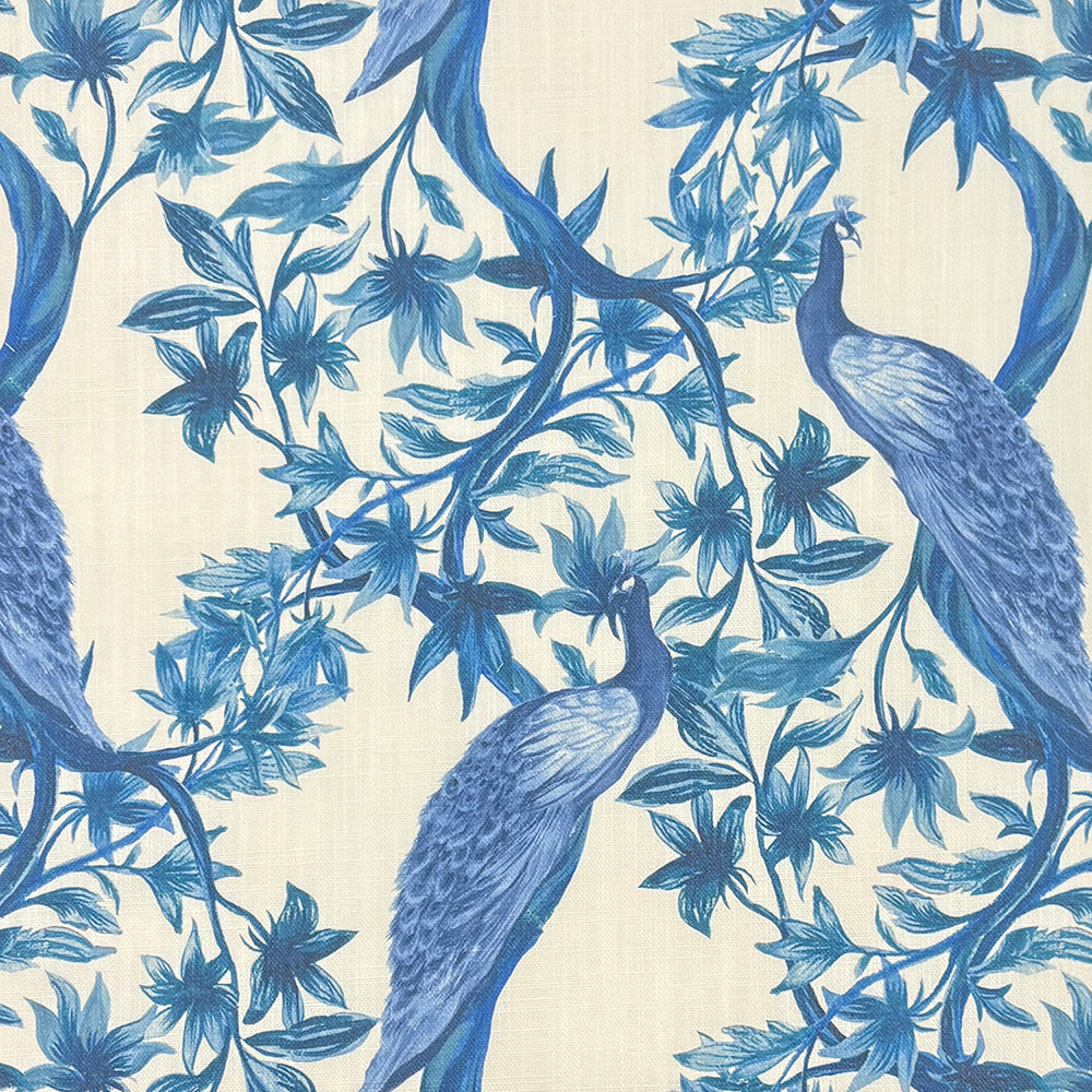 Bring exotic beauty into your home with the Javanese Linen Curtain Fabric in Delft Blue, a striking design featuring elegant peacocks set among trailing branches and foliage. Inspired by traditional Asian art, this fabric is printed on a linen union basecloth, offering both the natural texture of linen and the strength of cotton. It is perfectly suited for curtains, blinds, and cushions, adding sophistication and artistic character to any space.