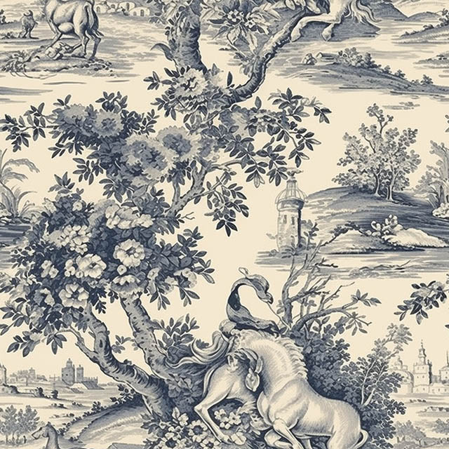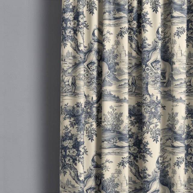 Crafted with the utmost attention to detail, this curtain fabric is made of premium quality linen, celebrated for its longevity and luxurious feel. The deep, rich navy hue is a dramatic and refined touch, effortlessly enhancing any interior colour scheme. The traditional Toile pattern, featuring delicate pastoral scenes inspired by the serene beauty of the French countryside, infuses an irresistible allure and romantic appeal to your décor.