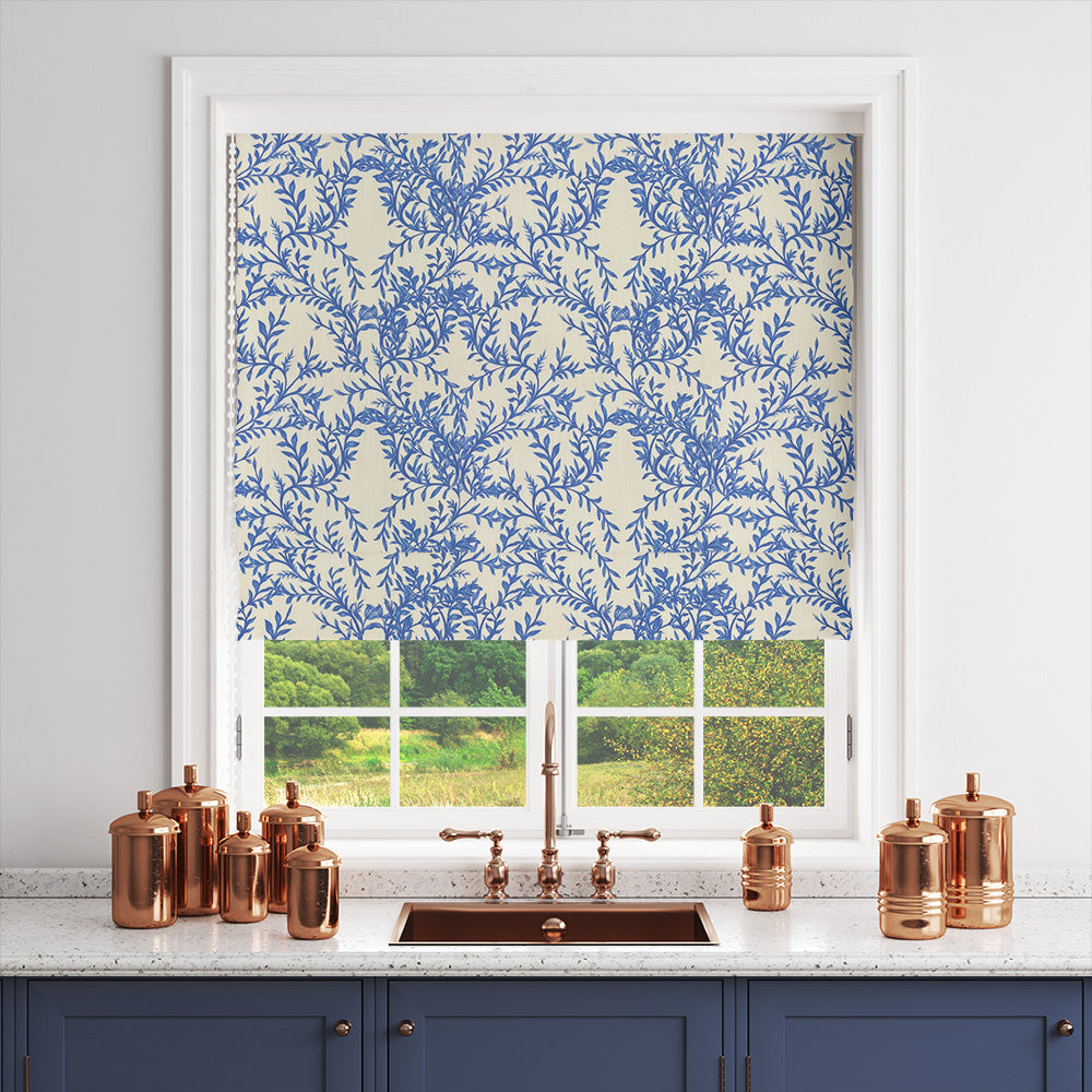 Vine Linen Curtain Fabric in Delft Blue