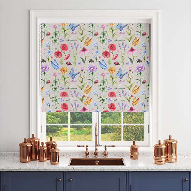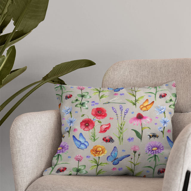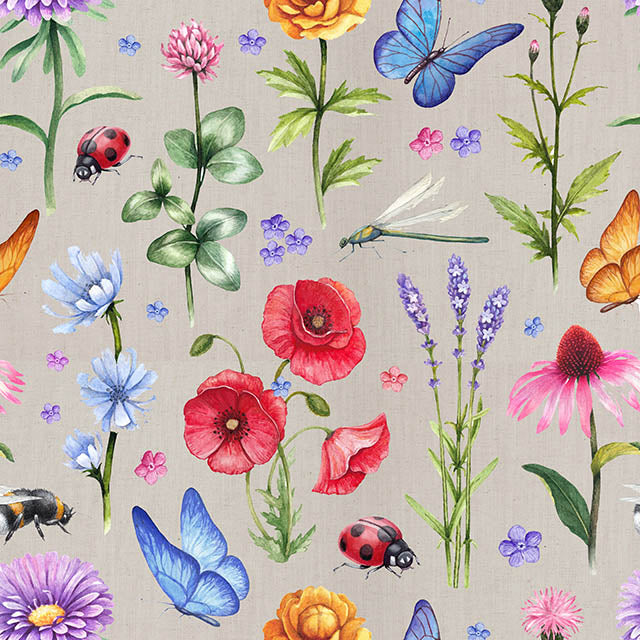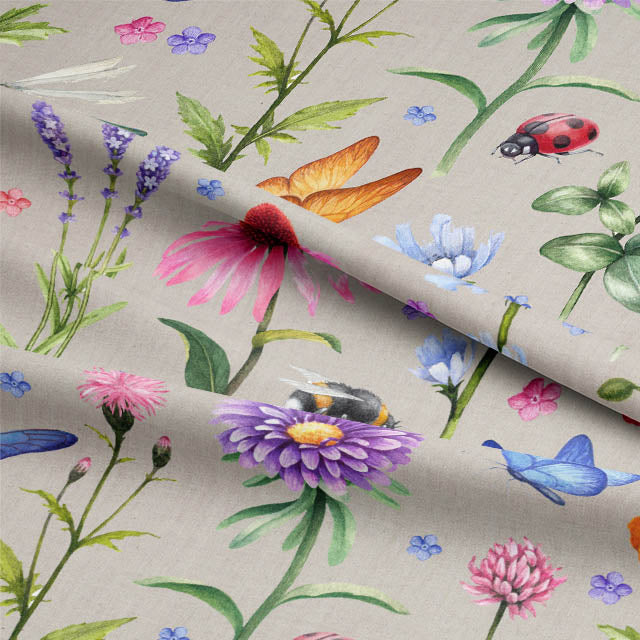 Step into a vibrant and enchanting world with this linen print fabric, blossoming with a variety of garden flowers and playful insects. This design, set against a natural backdrop, allows bold colours to burst forth, creating a striking look sure to enhance any living space.