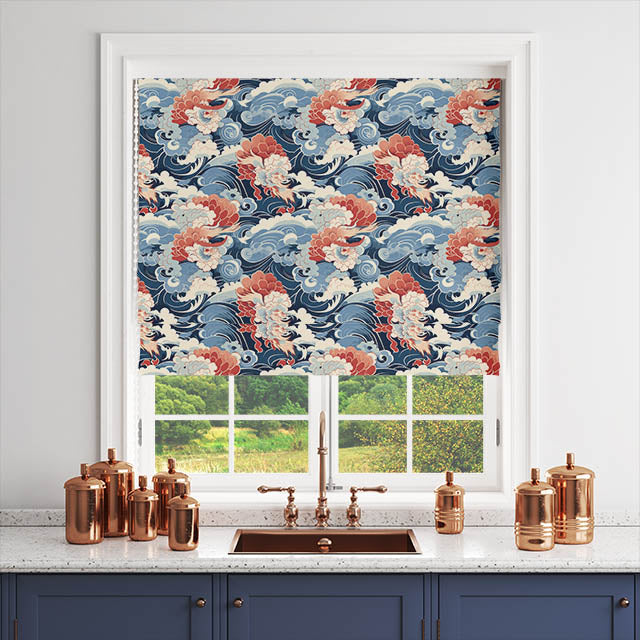Elevate your space with the striking Nagoya Linen Curtain Fabric in a serene blue colourway. This 22m wholesale discounted fabric roll features a stunning Japanese wave fabric design, inspired by traditional wave patterns, printed on a premium linen basecloth. Perfect for creating elegant curtains, this fabric brings a touch of artistic flair and tranquillity to any room.