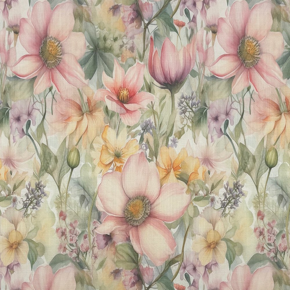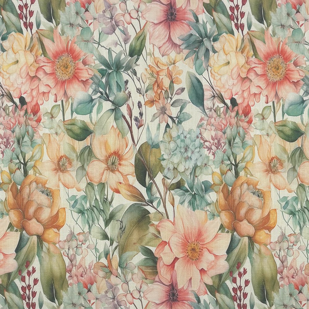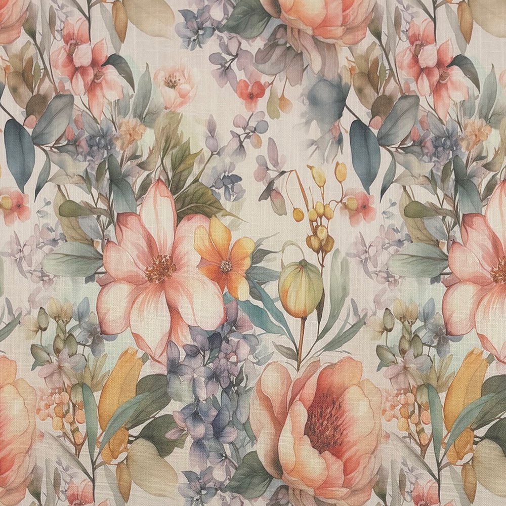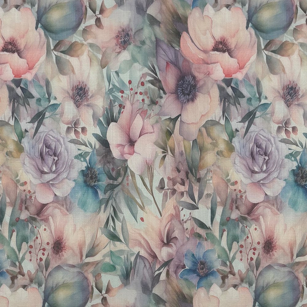 Printed on a high-quality linen union basecloth, this fabric combines the natural texture of linen with durability, making it ideal for curtains, Roman blinds, and even decorative cushions. The rich botanical detail captures wildflowers, roses, and meadow blooms in soft watercolour tones, creating a sophisticated yet inviting look for both modern and classic interiors.