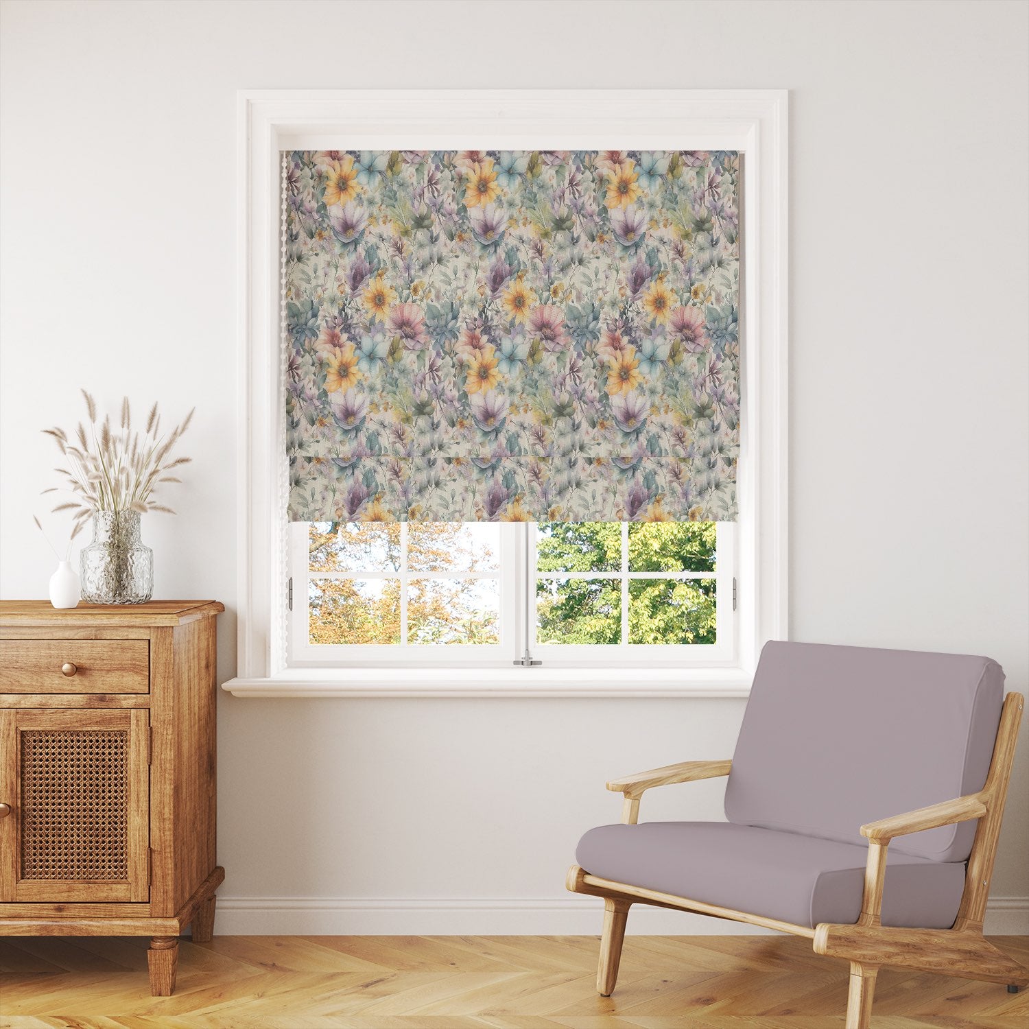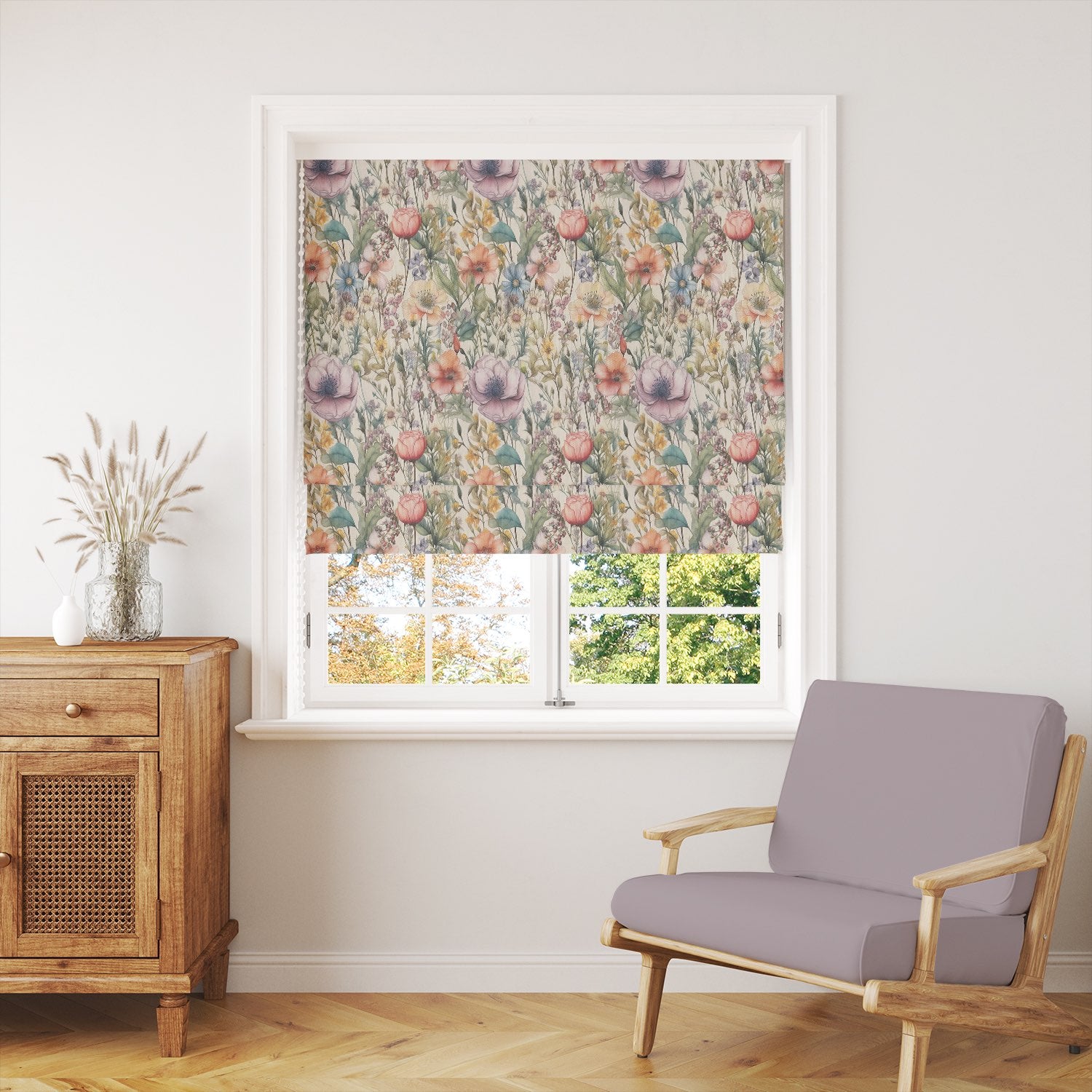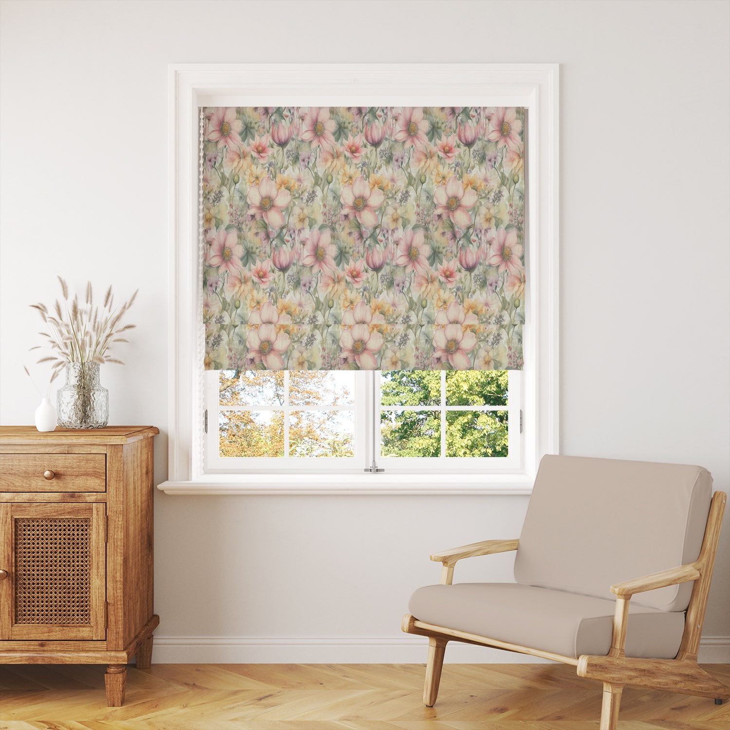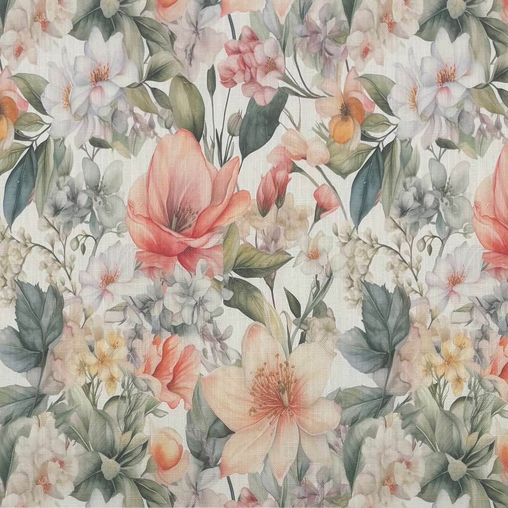 Printed on a high-quality linen union basecloth, this fabric combines the natural texture of linen with durability, making it ideal for curtains, Roman blinds, and even decorative cushions. The rich botanical detail captures wildflowers, roses, and meadow blooms in soft watercolour tones, creating a sophisticated yet inviting look for both modern and classic interiors.